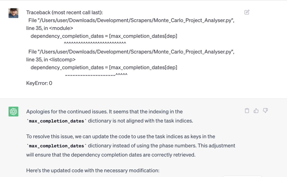 I found I got stuck in a seemingly endless loop of GPT-producing code, which I’d run and would then copy the resulting error back into GPT. Once I got through the errors, the output produced wasn’t what we’d previously discussed and didn’t answer my question about how long a project should take. When I pointed this out by pasting the output back to Chat GPT, pointing out the problems, it would produce more buggy code, which I’d have to get fixed before I could tell the output still wasn’t what I’d hoped for.