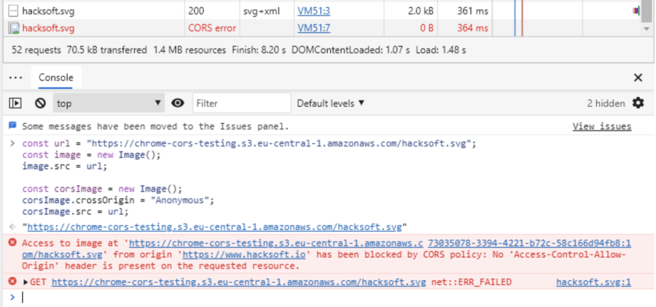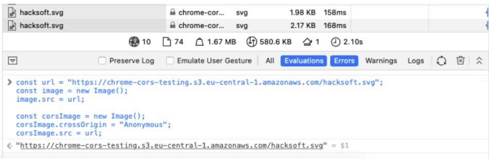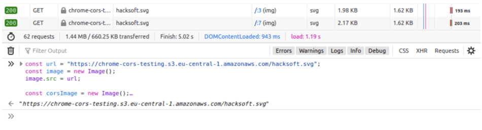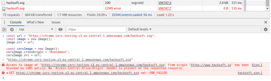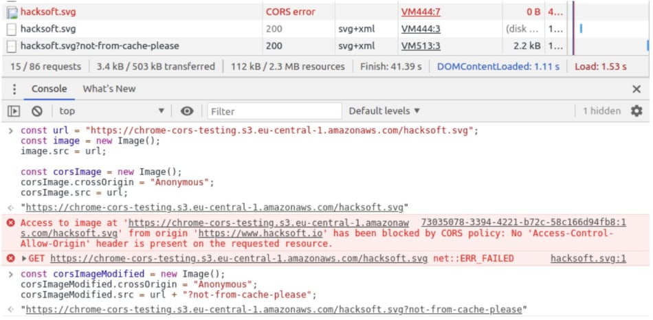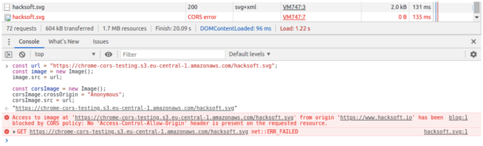 Note that the second time we try to load the image – Chrome returns a CORS error instead of a response object.