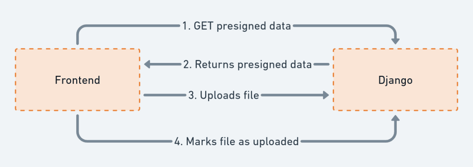 /api/upload/direct/start/ – We’ll be sending file name & file type. The API will return the presigned data. Part of the presigned data is the url, where we are going to upload to./api/upload/direct/finish/ – We’ll be calling this once the direct upload has finished. This will mark the file as successfully uploaded./api/upload/direct/local/<str:file_id>/ – This is the “edge-case” endpoint, for doing direct upload, but locally. This is for local development, when we don’t want to be running with AWS / S3 credentials.Again, we want to have the same backend interface & frontend code, no matter if we are uploading “direct to local” or “direct to S3”.