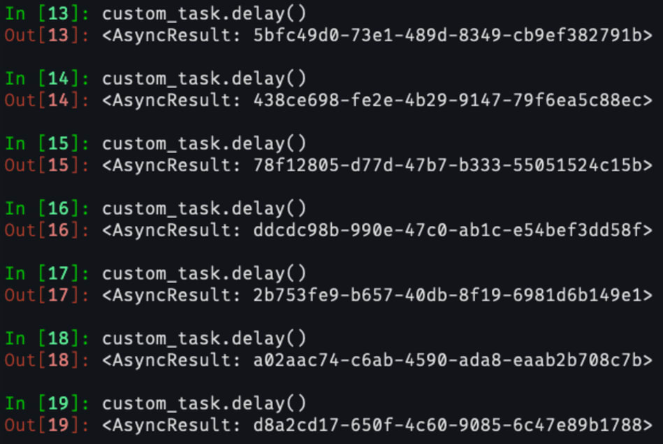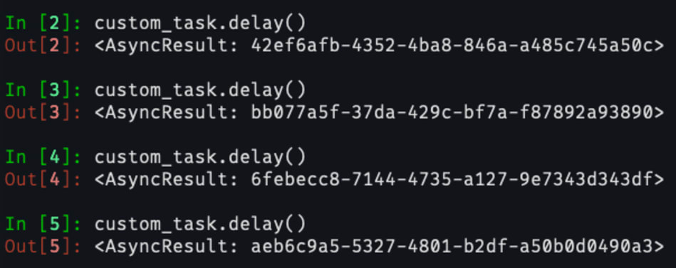 At this point, if you run celery inspect active, you can see the currently active tasks. You can also get this programmatically using inspect().active():