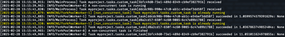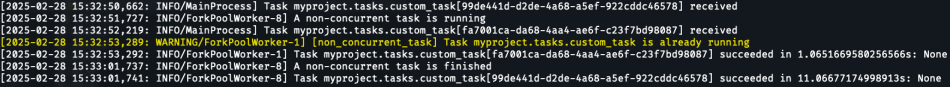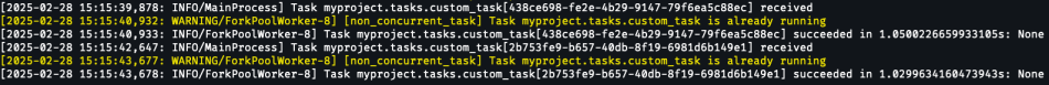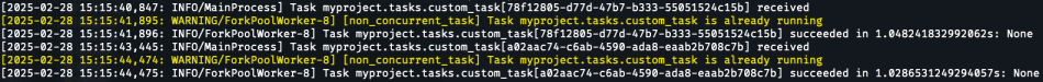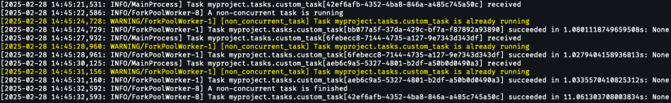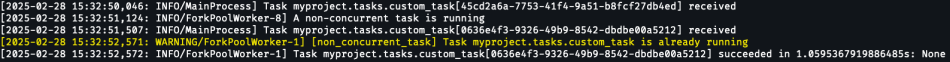 If you dispatch the non-concurrent task once, it will be processed by the worker as per usual. However, if you try to dispatch the same task a second time while the first execution is still not finished – you’ll see a warning message from the decorator itself, saying that a task with such name is already running in this queue: