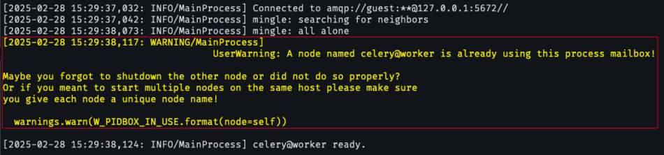 If you run the workers in this way, you will see the following warning (which is quite easy to miss, since Celery prints a lot of information when you initially start it):